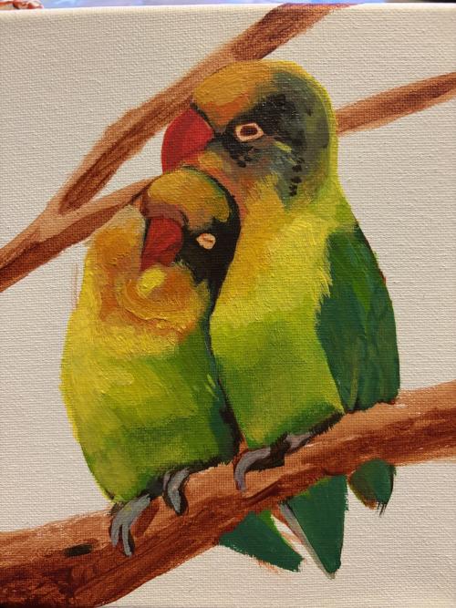 Bring a friend and join us Wednesday nights for an art workshop! Enjoy dedicated time for art and unwinding. In the month of May we will host a two-part class exploring color and realism as we paint Lovebirds using acrylic paint! During the first session we will draft the shapes using under painting techniques and block in color. The second session we focus on corrections and adding details to the painting.