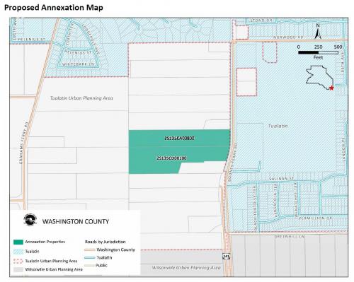 3J Consulting, Inc. on behalf of the City of Tualatin Parks & Recreation Division proposes to annex 14.31 acres of land located at 23465 & 23515 SW Boones Ferry Road (Tax Lots: 2S135CA00800 and 2S135CD00100) into the City of Tualatin from unincorporated Washington County. Future park improvements are not considered under this application.